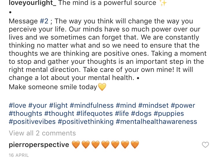 - Second post is a photo usually taken by Charlotte Pierro and these photos’ captions usually contain something positive for the individual to think about during the day or for them to appreciate